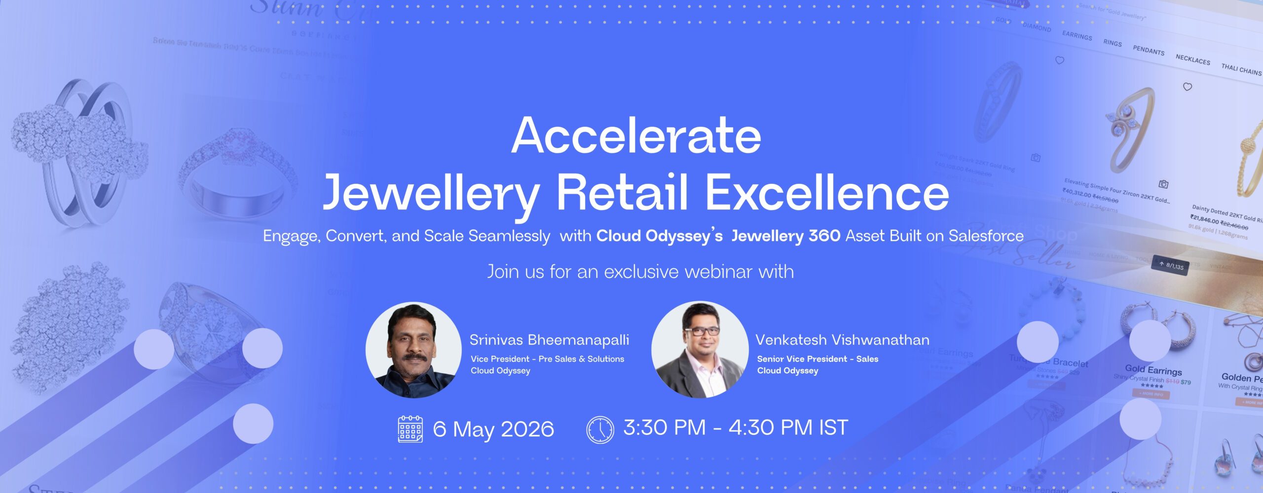 Cloud Odyssey and Salesforce invite you to an exclusive webinar on strategies that help jewellery retailers drive operational efficiency, revenue growth, and customer acquisition.